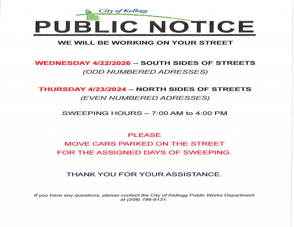 City of Kellogg (Owner) is requesting Bids for the construction of the following Project: City of Kellogg 2026 Road Project. Bids for the construction of the project will be received at the City of Kellogg located at 1007 McKinley Avenue, Kellogg, ID 83837, until Wednesday, April 1, 2026 at 2:00 p.m. local time. At that time the Bids received will be publicly opened and read.