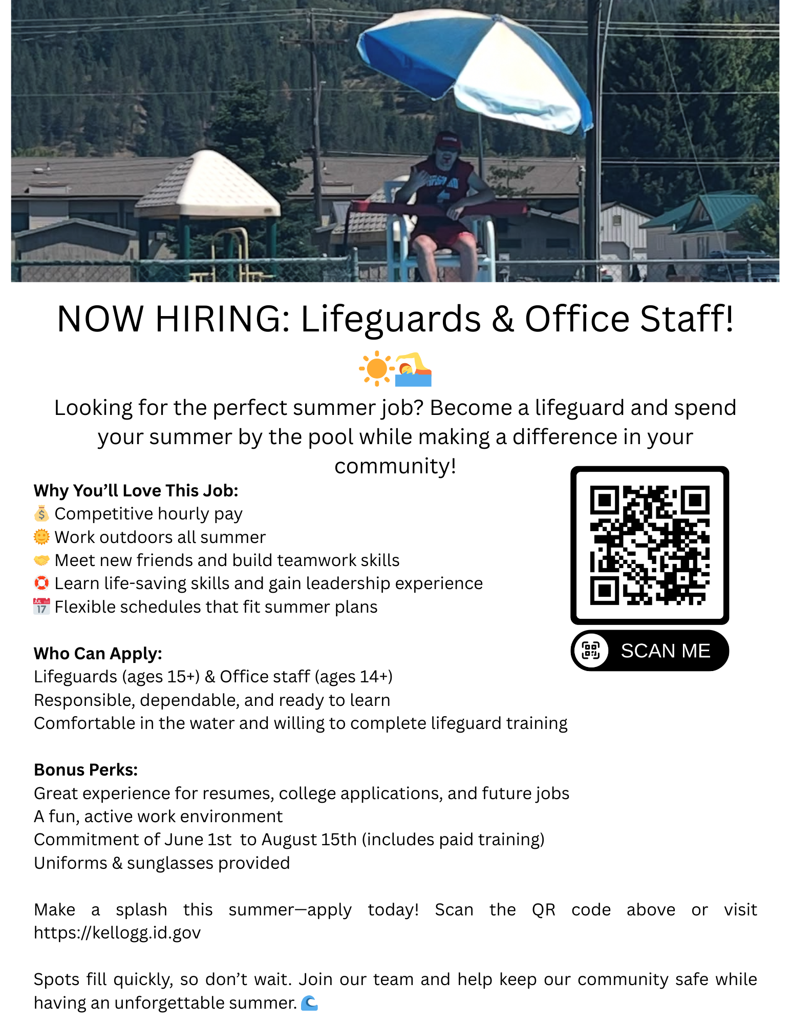 The City of Kellogg is a Drug Free Workplace. We offer competitive benefits and a great working environment.